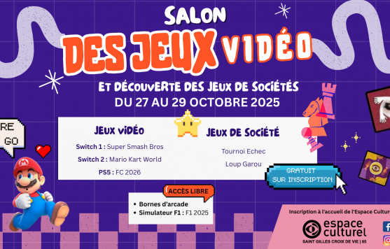 L’Espace Culturel de Saint Gilles Croix de Vie a le plaisir d’annoncer les dates de son Salon des Jeux Vidéo et de Découverte des Jeux de Société. Trois jours intenses dédiés à la passion du jeu, ouverts à tous et entièrement GRATUITS !